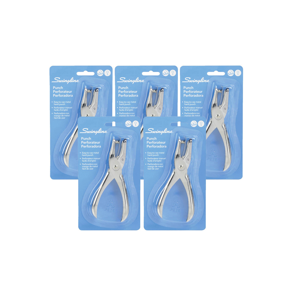 Single hole punch is useful at home, school or work and is great for traveling. Metal, handheld single hole punch, features a 5 sheet paper punch capacity, and creates a 1/4" hole. Paper chip holder makes clean-up fast and easy. Sold as a pack of 5 punches.