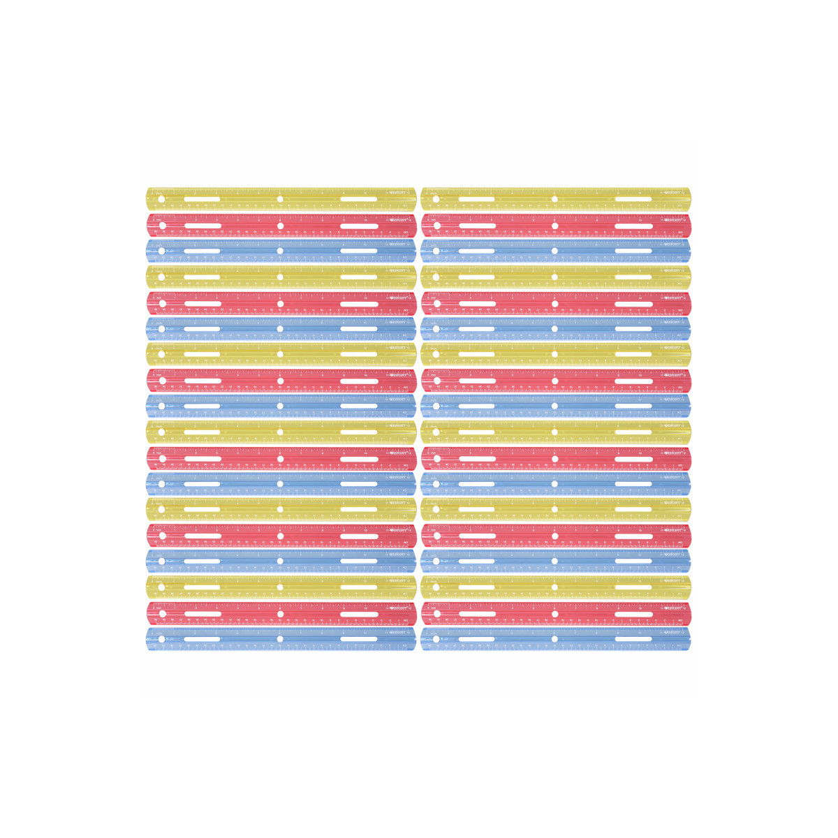 Westcott Drafting & Drawing Tools are some of the finest products of their kind for students and professionals. Our commitment to meticulous quality and cutting edge innovation in measurement and art materials has earned an unparalleled reputation. Durable plastic ruler is ideal for students. Beveled edge acts as an excellent drawing and drafting guide. Standard and metric markings simplify measurement tasks. Convenient two and three ring binder slots enable easy storage. Imperial (English)/Metric measurement system. 1/16" and metric scales. 12". Sold as a pack of 36 in assorted colors (no color choice): Red, Yellow, and Blue.