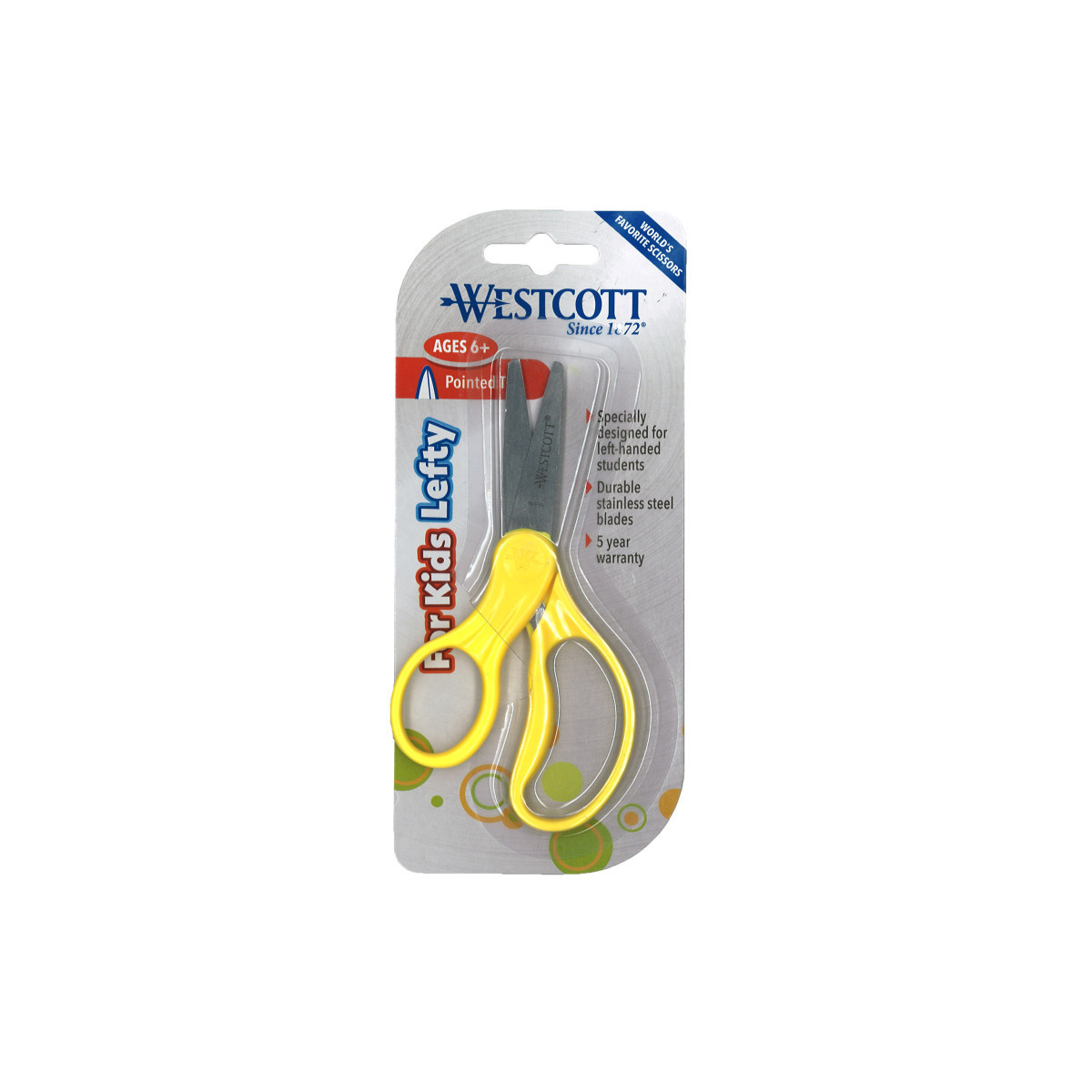 Westcott has provided the world with innovative and well designed products for over a century... at affordable prices, without sacrificing quality. Westcott is dedicated to supporting education and inspiring creative activities in the classroom and at home. Products are specifically designed for growing students, created to be fun and functional with superior quality and exceptional value. These Westcott For Kids Scissors are specially designed for left-handed use. Extra strong and durable stainless steel safety blades. Easily cut through paper, fabric, string and other craft materials. Sold individually in assorted colors (no color choice). 5" Pointed.