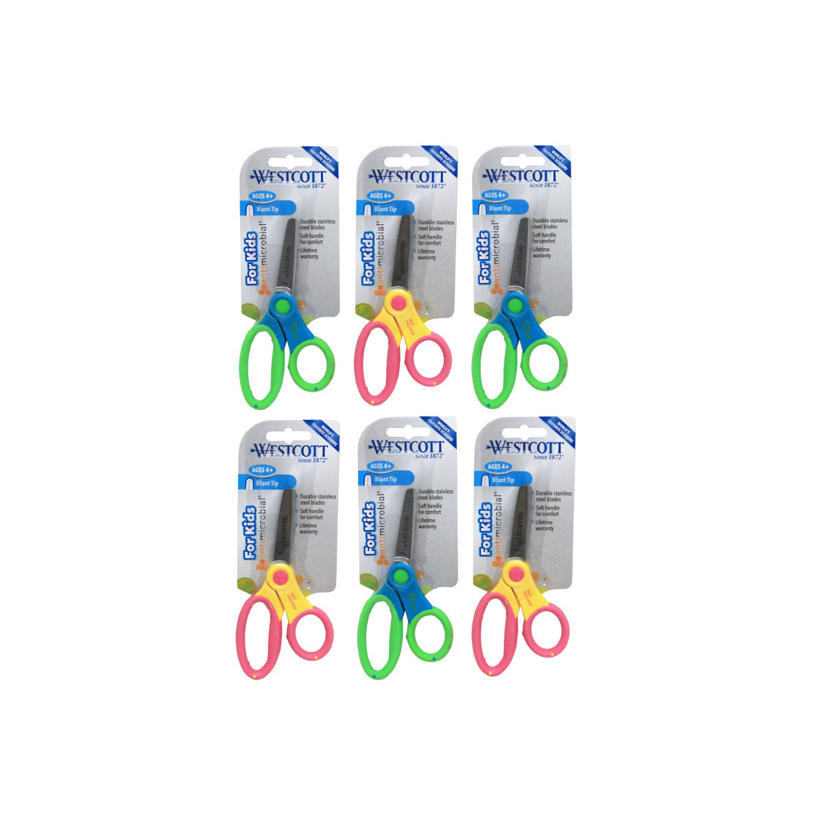 Westcott® offers a wide range of anti-microbial products that contain an antimicrobial agent to help inhibit the growth of bacterial stains and odors. Westcott® is dedicated to supporting education and inspiring creative activities in the classroom and at home. Products are specifically designed for growing students, created to be fun and functional with superior quality and exceptional value. The Westcott 5" Blunt Scissors with Anti-Microbial Protection features soft handle for added comfort and durable stainless steel blades. Perfect for cutting projects, in the classroom or at home. For ages 4 and up. Sold as a pack of 6 in assorted colors (no color choice).