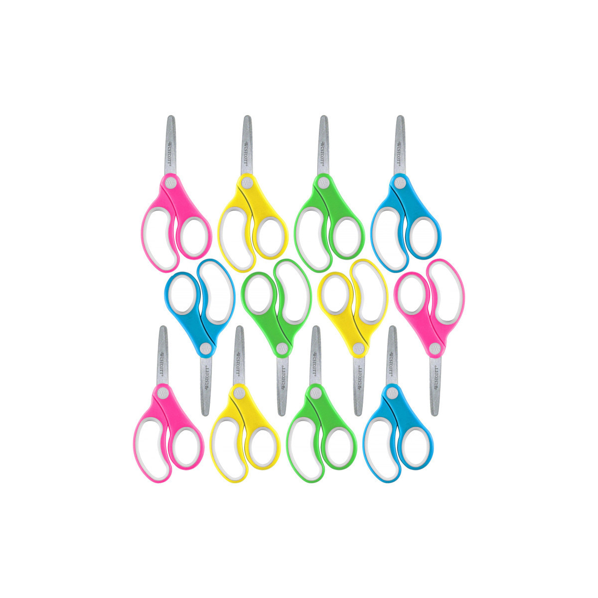 Westcott scissors feature stainless steel blades and comfortable soft handles that are suitable for left-handed and right-handed children. 5" Blunt Tipped Scissors are specially designed for a child's hand. An inside grind on the stainless steel blades mean they are accurate and dependable. These scissors cut easily through paper, fabric, string, and other craft material. Westcott is dedicated to supporting education and inspiring creative activities in the classroom and at home. Products are specifically designed for growing students, created to be fun and functional with superior quality and exceptional value. For ages 4 and up. Sold as a pack of 12 in assorted colors (no color choice).