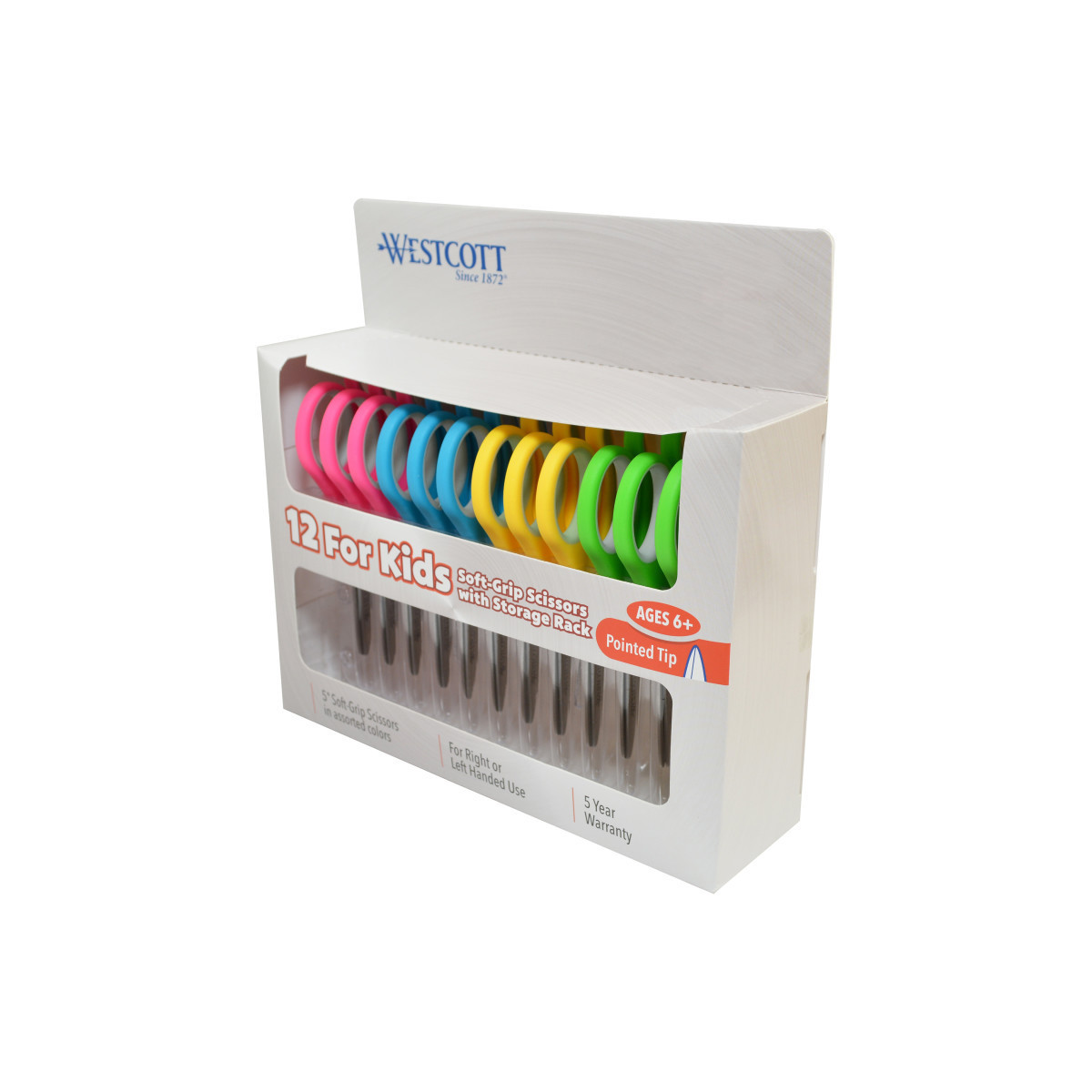 Westcott is dedicated to supporting education and inspiring creative activities in the classroom and at home. Products are specifically designed for growing students, created to be fun and functional with superior quality and exceptional value. Stainless steel blades with soft comfortable soft insert on handle. Classroom pack with storage rack contains twelve 5" kids scissors with pointed tip suited for ages 6+. Handles designed for left or right hand use. Assorted colors.