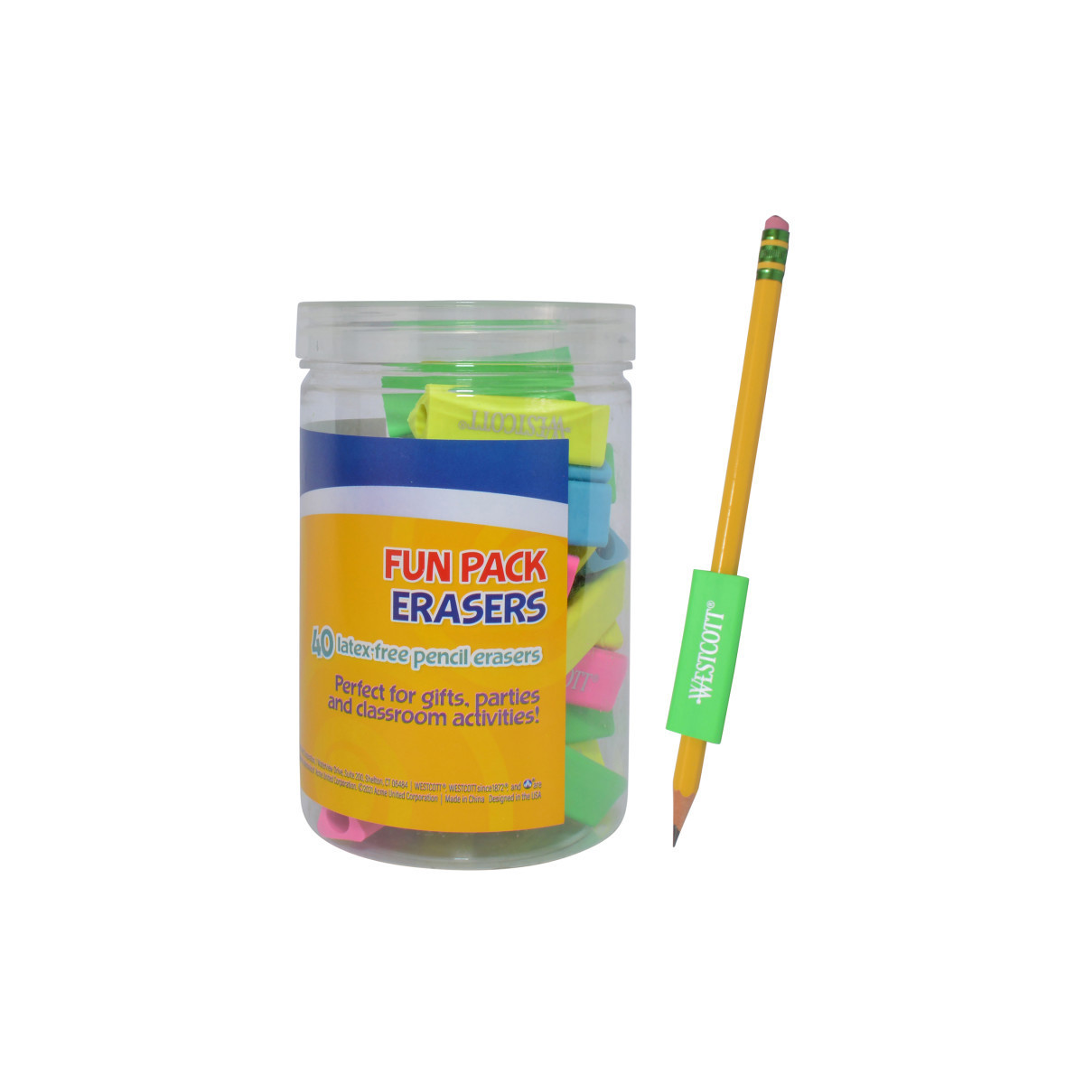 - 40 erasers in reusable tub with lid, for easy storage.