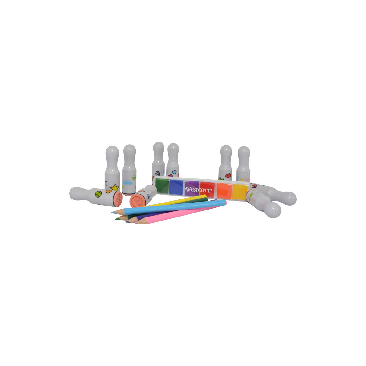 - Includes ten rubber stamps, a six-color ink pad of washable inks and five colored pencils