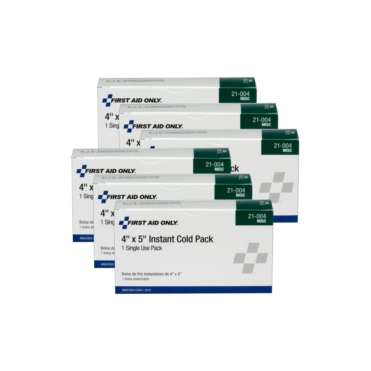 Single use instant cold pack. Activates easily to provide instant relief. Provides an anesthetic effect which relieves aches and pains. Active Ingredients: Urea, Water. The cold pack measures 4" x 5" and is packed in a unitized box refill that fits well into first aid kits. Perfect for standalone first aid or as a refill for a kit. Sold as a pack of 6.
