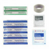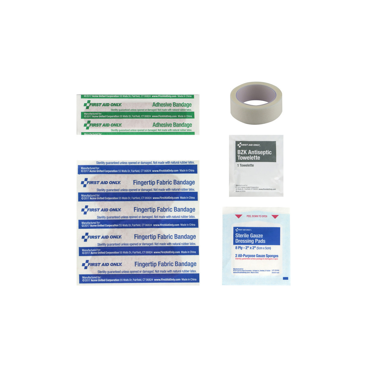 - Includes 9 pieces: 1 x BZK Antiseptic Towelettes, 1 x Fabric Fingertip Bandages, 1 x First Aid Tape, 1/2" x 2.5yd, 4 x Plastic Bandages, 3/4" x 3", and 2 x Sterile Gauze Pads, 2" x 2".