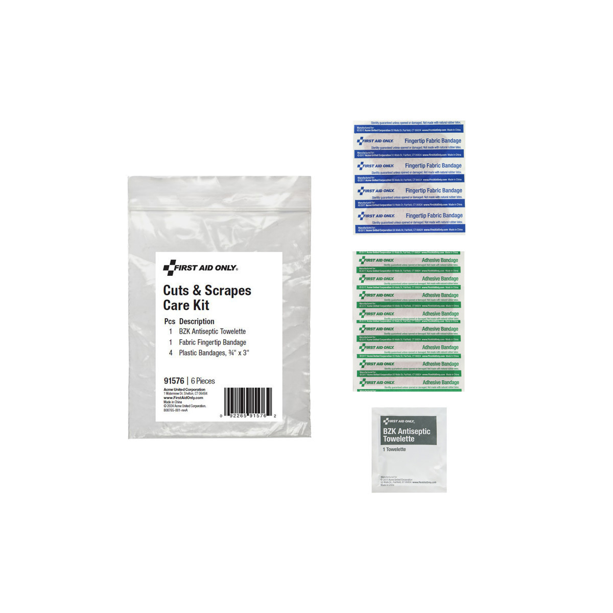 - Contains 1 x BZK Antiseptic Towelettes, 1 x Fabric Fingertip Bandages, and 4 x Plastic Bandages, 3/4" x 3"