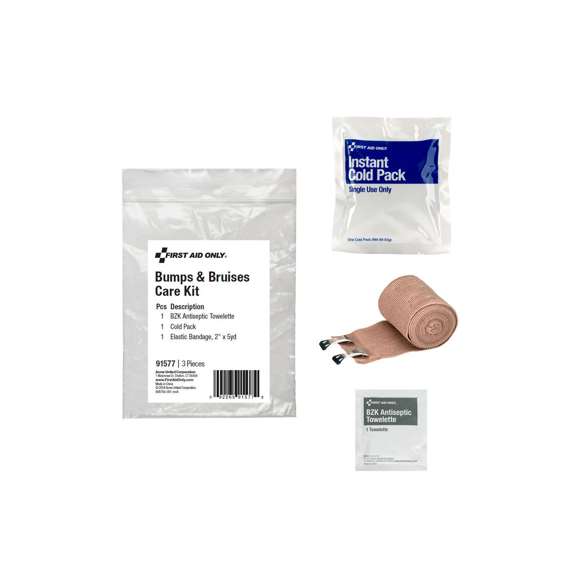 Handle bump and bruise injuries with ease with this Bumps & Bruises Care Kit. Perfectly portioned to contain just what you need to treat minor bumps or bruises, the single use pack may be discarded after use. Refills the 91575 Care Kit or supplements existing first aid kits. Contains 1 x BZK Antiseptic Towelettes, 1 x Cold Pack, and 1 x Elastic Bandage, 2" x 5yd.