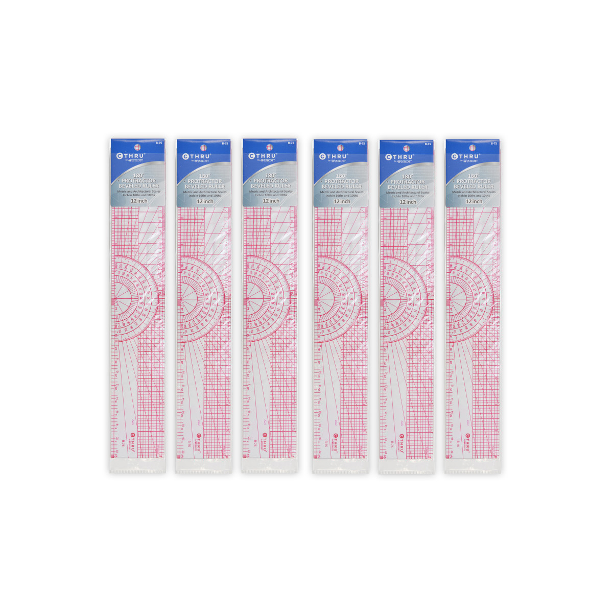 The Westcott Beveled Protractor Ruler is a versatile tool measuring 12 inches, designed for precise and smudge-free inking. It features calibrated scales in 16ths to the inch, centimeters, architects' scale, and tenths to the inch, as well as 8ths and tenths graph sections for added convenience. Laminated for durability, this ruler is translucent in color, allowing for easy viewing through to the page, making it perfect for all your drafting and drawing needs. Sold as a pack of 6.