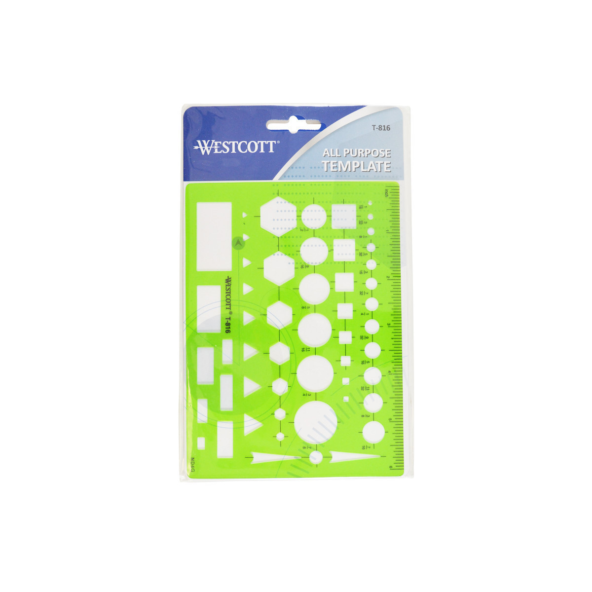 The Westcott General Purpose Template is a versatile tool that offers openings for circles, squares, triangles, rectangles, and hexagons. It features an inch scale with center lines provided, making it easy to measure and draw accurately. The translucent color of the template allows for clear visibility of the page underneath, making it ideal for use in the home or classroom.