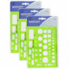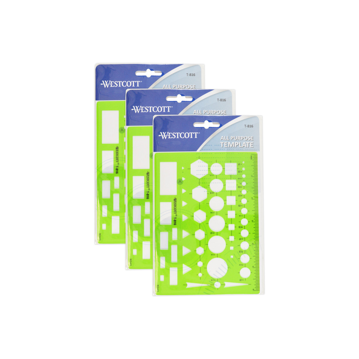 The Westcott General Purpose Template is a versatile tool that offers openings for circles, squares, triangles, rectangles, and hexagons. It features an inch scale with center lines provided, making it easy to measure and draw accurately. The translucent color of the template allows for clear visibility of the page underneath, making it ideal for use in the home or classroom. Sold as a pack of 3.