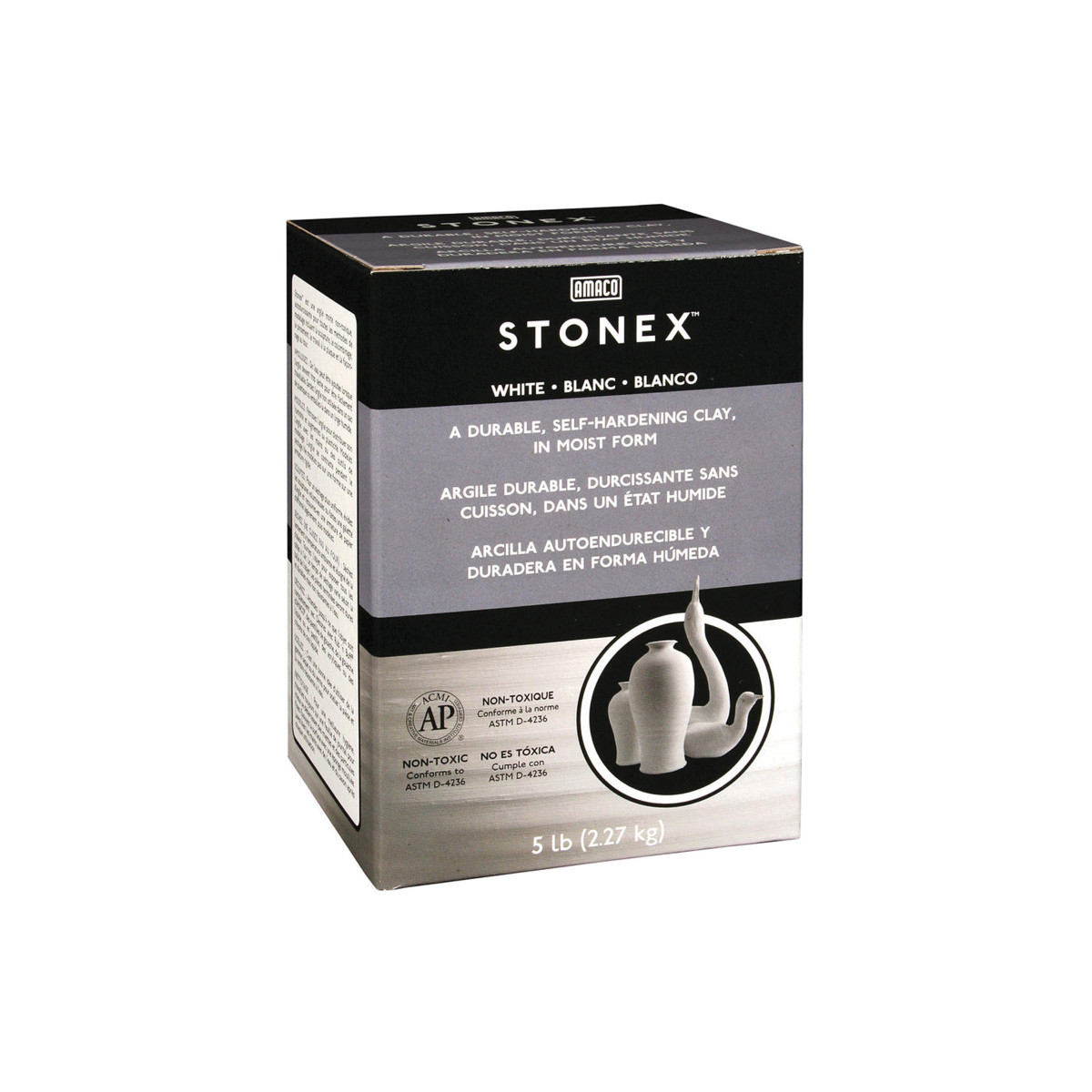 Our premium quality pale white self-hardening clay is formulated for handbuilding, wheelthrowing and sculpture techniques. Knead Stonex to increase plasticity before modeling. Moist, ready to use. Pieces dry hard and durable, but not waterproof. Can be painted. Includes 5 lbs.