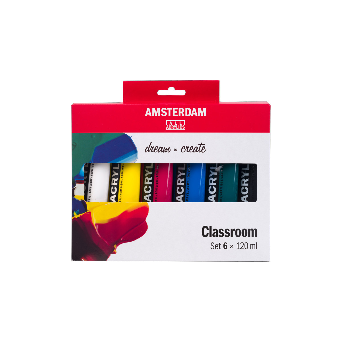 Includes six 120 ml (4 oz) tubes of Titanium White, Primary Yellow, Primary Magenta, Primary Cyan, Phthalo Green, and Oxide Black