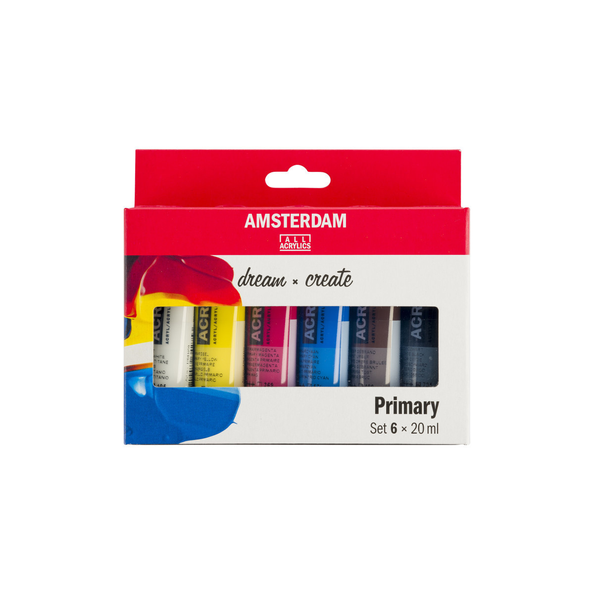 Amsterdam Standard Series Acrylic offers you the broadest range of remarkably vibrant acrylic colors. This versatile paint is easy to work with and offers a smooth application. Use the paint straight from the tube or thinned with a little bit of water or one of our acrylic mediums. This set contains Titanium White, Primary Yellow, Primary Magenta, Burnt Umber, Primary Cyan, and Oxide Black.