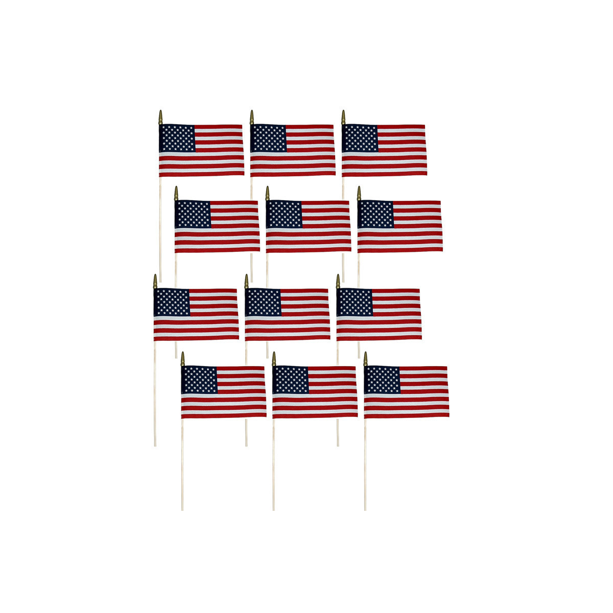Verona Brand Hand-Help U.S. Flag measures 8" x 12" with a 5/16" x 24" black staff and a gold spear tip. This flag material is a fabric blend with the look and feel of cotton. Engineered to be fade resistant in outdoor conditions, Verona Brand Flags wave proudly at parades and are most often used to mark our veterans' graves. Sold as a pack of 12 flags.
