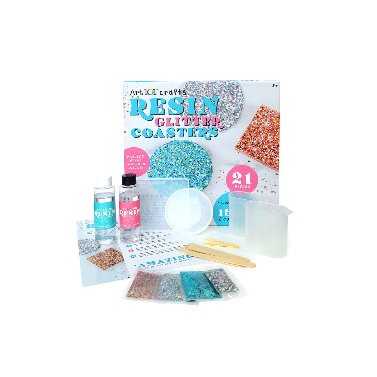 Explore the latest resin craft trend with Art 101 Craft's Resin Glitter Coaster Kit! Your box set includes 23 total pieces to create a sparkly coaster set, including 3 fl oz of resin, 30 fl oz of resin hardener, 4 packs of glitter, 5 stirring sticks, 2 measuring cups, 5 toothpicks, 1 pair of gloves, and 1 project guide. These coasters are the perfect beginner resin project for crafters of all skill levels. Our handy project guide walks you through casting your resin coasters step-by-step, and reviews all of the appropriate safety information. Customize your coasters by combining glitter mixes to your liking, combine with your resin, and pour into your molds. We've included a square and round mold for a variety of options. Let your project cure overnight and remove from the mold to display your new project!