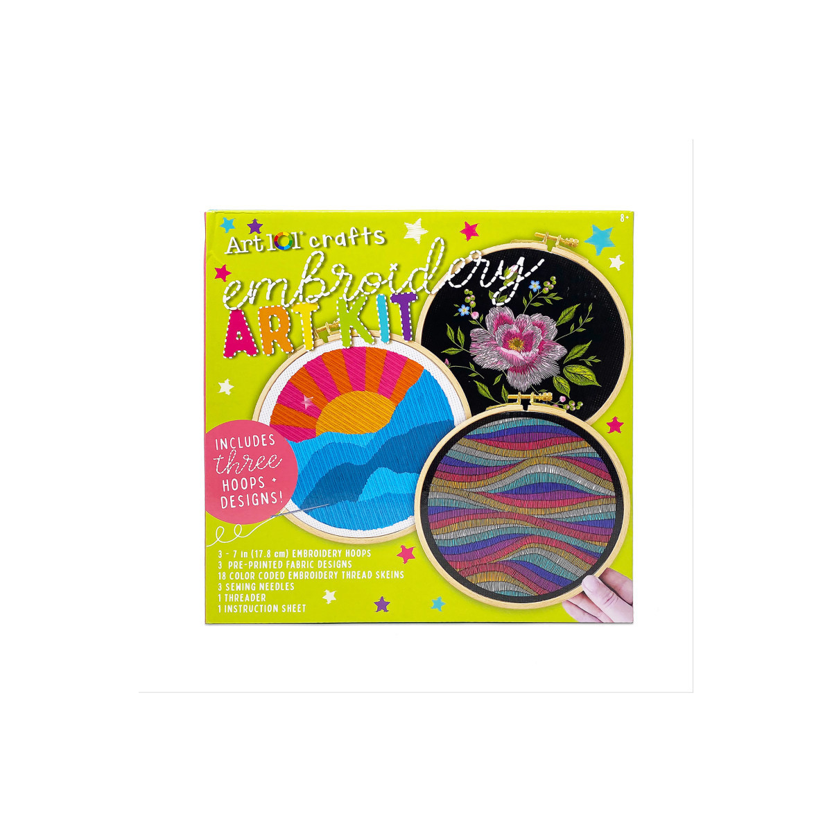 Art 101 Craft's Embroidery Art Kit is the perfect set to explore the popular crafting trend of embroidery art! With three designs suitable to all skill levels, embroidery is a great relaxing and creative, hands-on activity to decrease your screen time and take up a new hobby! Each design was carefully curated by our design team, and includes a variety of different motifs: a floral design, a gradient mountain design, and a colorful wave pattern. Your kit comes with 3 different 7-inch embroidery hoops, 6 skeins of embroidery thread for each design, and 3 sewing needles, allowing you to start multiple projects concurrently or take some on-the-go! Your kit also includes a handy threader, which makes threading your embroidery floss through your needle a breeze. Each design should have more than enough thread to cover the project - we included a little extra! If you are new to embroidery, don't fret! We've included a project guide to cover the beginner basics. Enjoy hours of relaxing embroidery bliss!