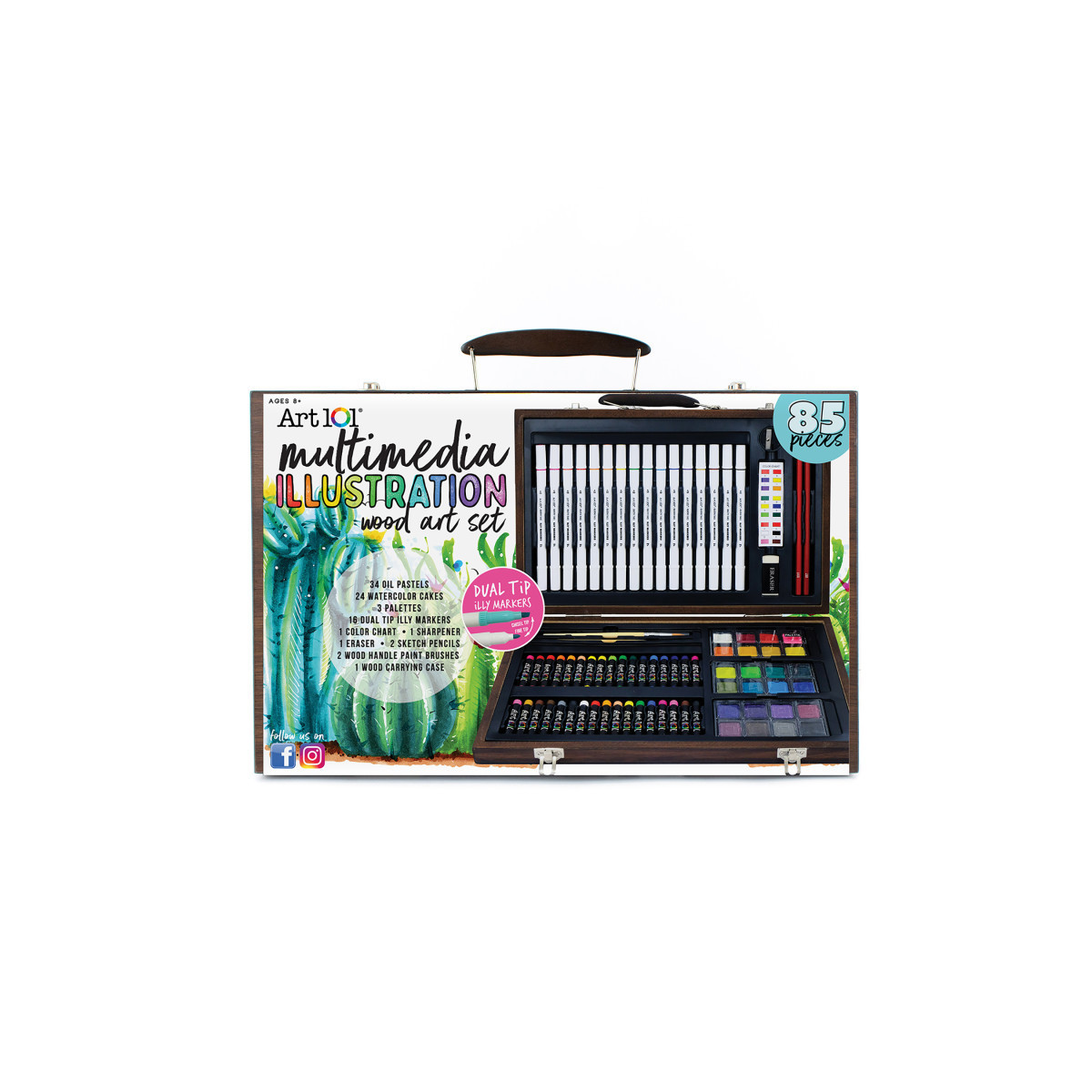 Art 101's Multimedia Illustration Wood Art Set comes with 85 pieces, including a number of different mediums that are perfect for creating your next illustration! This set features our professional quality, alcohol-based Illy Markers, which come with a dual chisel and bullet nibs. Use the chisel nib to shade in large areas and use the bullet side to add fine lines or detail! Your vibrant set of Illy Markers also includes a blending Illy, which allows you to seamlessly blend your colors as you draw. These markers are perfect for illustrations, fashion design, scrapbooking, architectural drawing, calligraphy, and more! You will also find in your set 34 of our creamy and pigmented oil pastels, making it easy for you to shade and blend the colors to create depth and dimension. Sketch out your composition before adding additional mediums with the included two sketch pencils, sharpener, and eraser. Want to try your hand at painting? Use the 24 watercolor cakes and included paint brushes to add soft and light colors. If you need some extra guidance when blending and creating new colors, refer to the handy color chart also included. Organize all of your artistic tools in a high-quality, convenient wooden carrying case, making them easy to use whenever inspiration strikes!