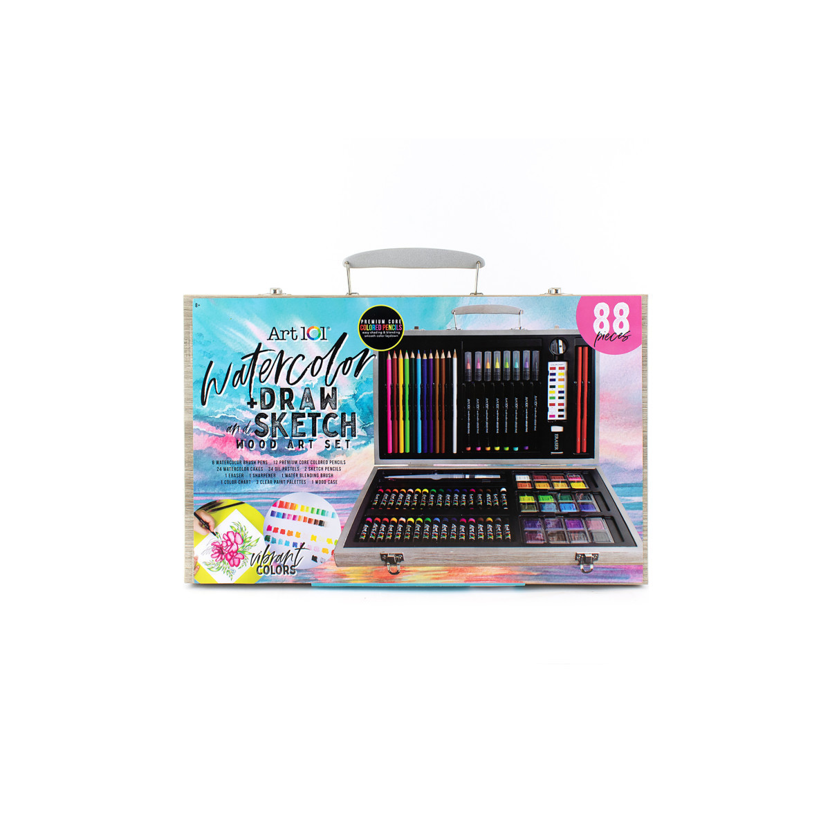 Art 101's Watercolor Draw and Sketch Wood Art Set delivers 88 pieces of mediums perfect for the beginner or advanced artist looking to explore watercolor painting! This set includes our popular Watercolor Brush pens, which have the versatility of traditional watercolor packed into an easy-to-use pen. These pens allow more control when applying color to your paper, blend beautifully, and let you achieve a number of watercolor effects such as color washes and gradients. You can also use the 24 watercolor cakes for a more traditional approach to watercolor painting. Use the water blending brush with both mediums, which has an easy-to-fill water reservoir, eliminating the need for multiple paint brushes and water cups.