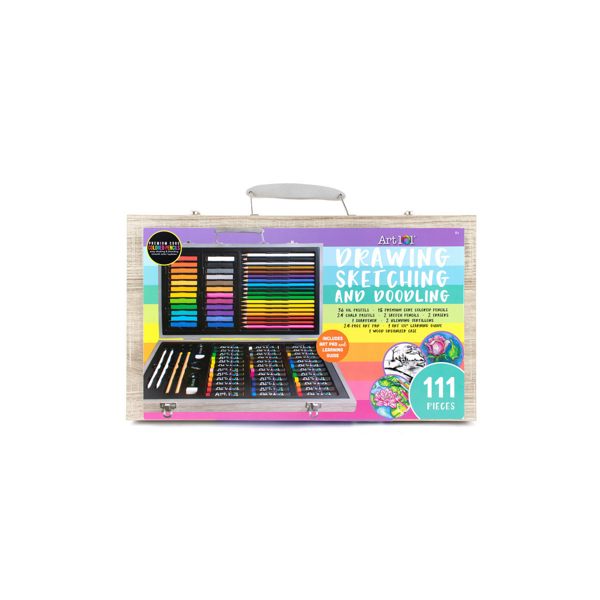 Our Art 101 Drawing, Sketching, and Doodling Wood Art Set comes with 111 pieces geared towards creating dynamic drawings. This set includes 24 pigmented chalk pastels and 36 creamy oil pastels. Both mediums lay down on your paper beautifully, making it easy for you to shade and blend the colors to create depth and dimension. Your set also includes two tortillons to aid in blending and shading. Use the 18 colorful Premium Core Colored Pencils, which are perfect for the beginner and advanced artist alike! Build up the color and opacity by varying the pressure on your pencil, and blend different colors together to create different shading effects! Plan out your compositions with the included 2 sketch pencils, sharpener, and erasers before adding additional mediums. Whether you are an expert or beginner artist, each set includes a learning guide covering the basics of drawing principles. Once you're finished with your drawings, all of your components are easily organized in the trendy wood carrying case, making it easy to take wherever inspiration strikes next!
