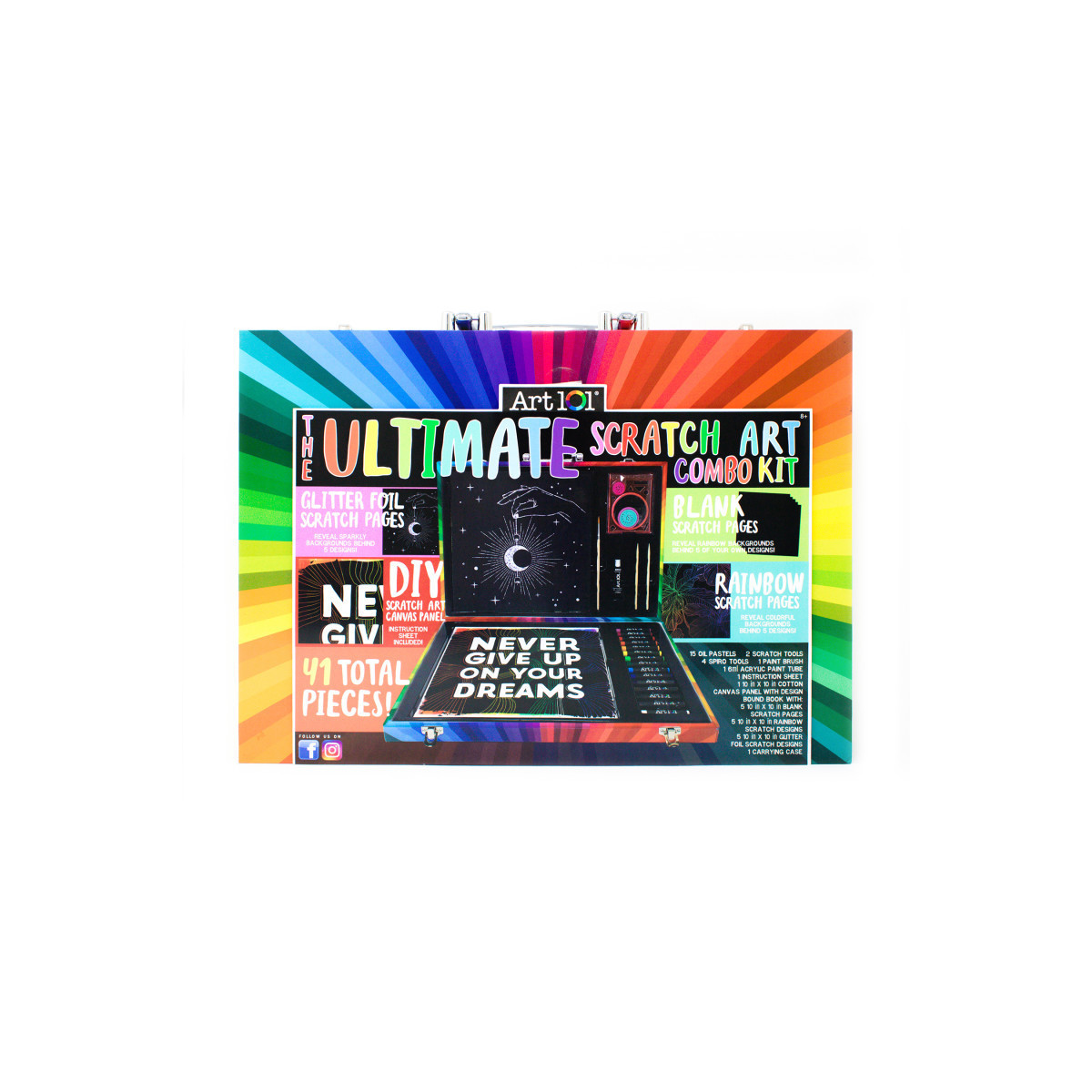 Art 101's Ultimate Scratch Art Combo Kit with 41 Pieces in a Colorful Carrying Case features a variety of fun scratch art activities in a colorful, portable case. Your set includes five 10 inch by 10 inch rainbow scratch sheets and five 10 inch by 10 inch glitter scratch sheets, each with a trendy pattern curated by our design team to provide hours of creative fun! Use your scratch tool to trace the patterns and reveal fun colors or sparkly backgrounds. Your set also includes five blank 10 inch by 10 inch scratch sheets to create your own patterns or scratch art designs. We've also included everything you need for a fun do-it-yourself scratch art project, including one 10 inch by 10 inch cotton canvas with a fun quote design, 1 black acrylic paint tube, 1 paint brush, 15 oil pastels, and scratch tools! Follow the step-by-step instructions included inside to create your own unique canvas design that you can proudly display once complete!