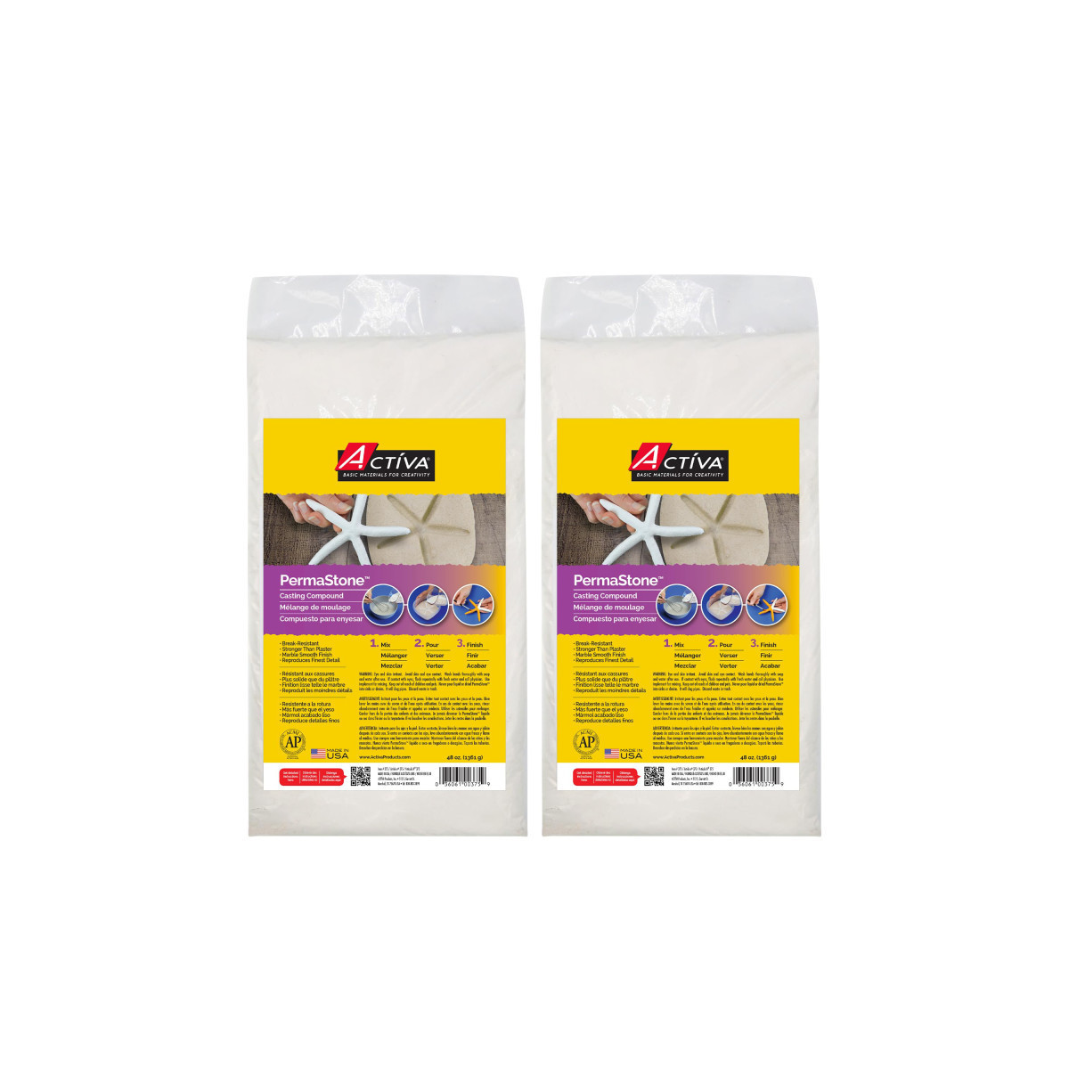 PermaStone is the ideal casting compound when permanent, break-resistant castings are desired. It handles like plaster and has a stone-like finish. ACTÍVA PermaStone mixes easily with water and reproduces the finest detail. If it happens to break the fracture is clean and easily glued/fixed. As it dries white, it can be painted with acrylics, oils, watercolors, tempera or any other finish! PermaStone is microwavable, non-toxic, and water resistant. Each bag includes 48 oz. of PermaStone. Sold as 2 bags.