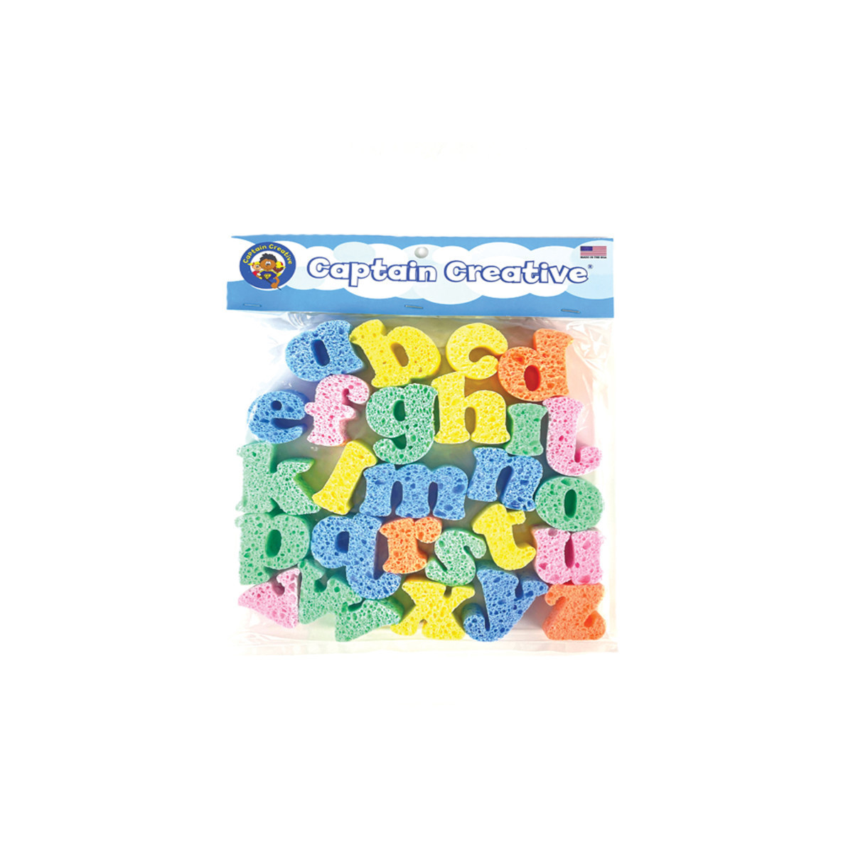 Captain Creative Super Sponges are made of real cellulose and are one inch thick. These high quality sponges should be rinsed out and washed before your first use and every occasion thereafter. Super Sponges are 1" thick, very sturdy but may be ripped with some good effort and may become a choking hazard with small pieces for children. This product should be used with children who have adult supervision. This product has 26 sponge letters, they are all lower case, they are in different colors and they are all bold.