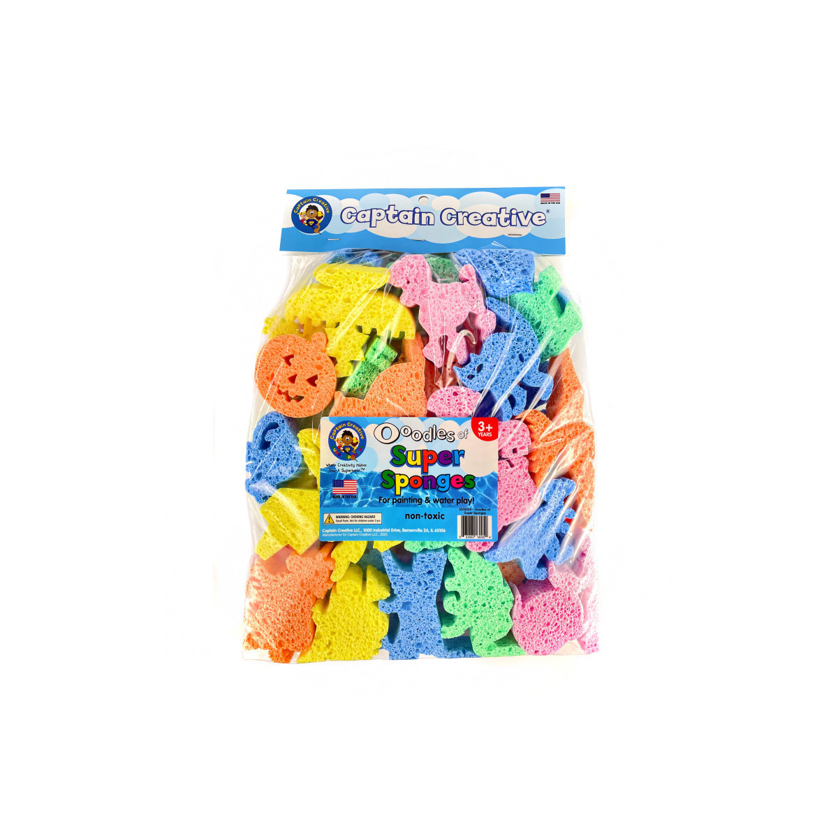 Captain Creative Super Sponges are made of real cellulose sponge material and they are one inch thick. It is best to rinse and wash the sponges before the first use and for every use after that. Each pack will contain a variety of shapes, colors, sizes and quantities with no two packs typically the same. Super Sponges are great for sponge painting, sand and water tables, and bath time. Super Sponges are 1" thick and made of cellulose sponge material perfect for sponge painting and water play. The sponges are not made for children under the age of 3 years old.