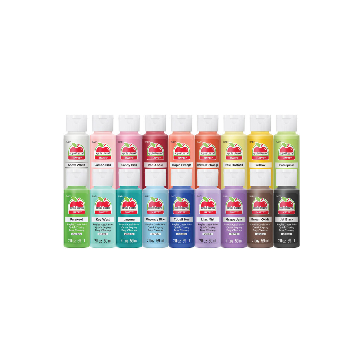CONVENIENT SIZE & FUN BRIGHT COLORS- This versatile acrylic paint set includes 18 - 2 oz bottles of colorful craft paint. The colors in this kit include: Snow White, Pale Daffodil, Yellow, Caterpillar, Parakeet, Key West, Regency Blue, Laguna, Cobalt Hue, Lilac Mist, Grape Jam, Cameo Pink, Candy Pink, Tropic Orange, Harvest Orange, Red Apple, Brown Oxide, and Jet Black.
