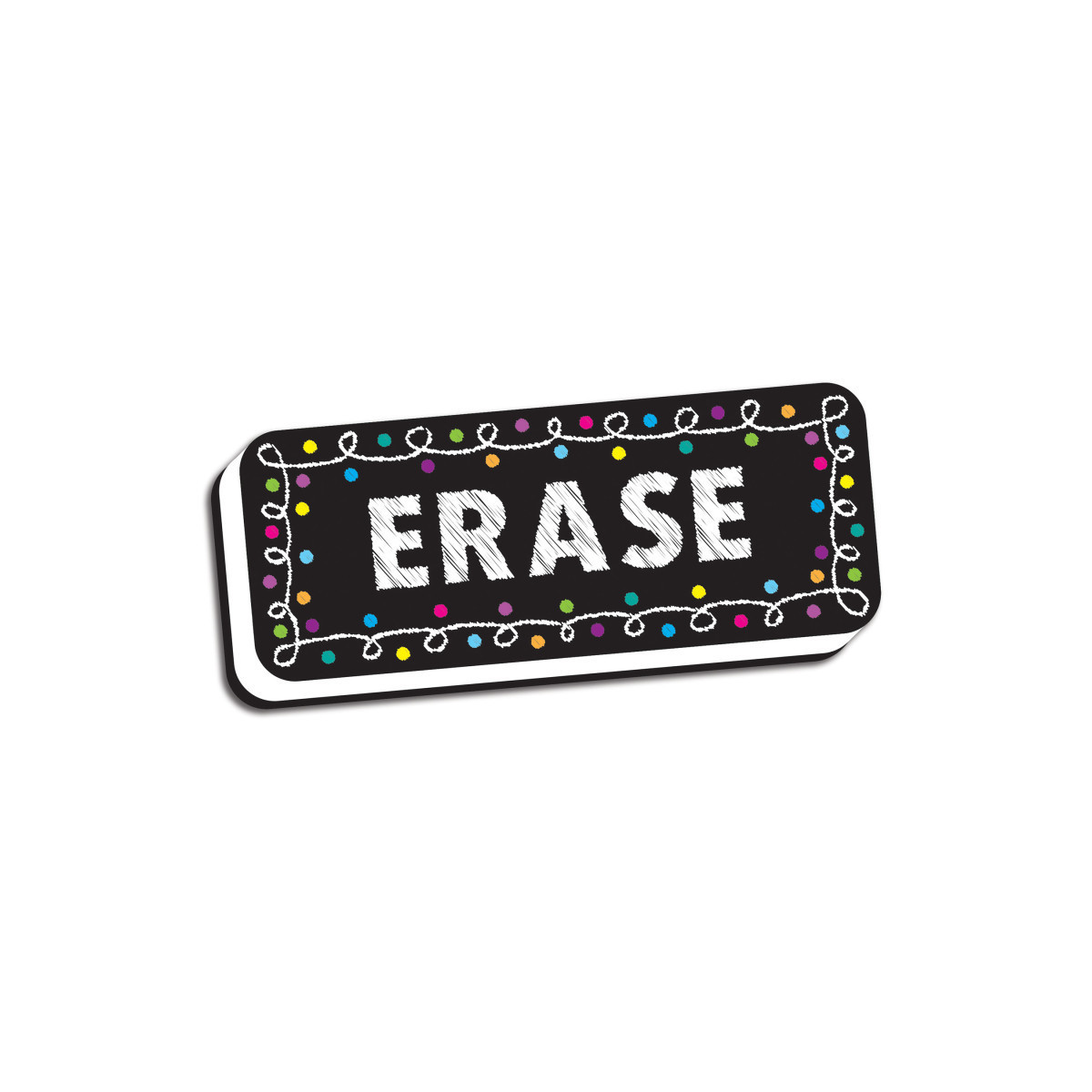 Fun and colorful design to brighten up your magnetic whiteboard. Easy to grip and hold for adults and children. Use with dry erase markers. Eraser is made from a durable foam with a black felt erasing surface. Built in magnet helps to easily stick to magnetic whiteboards and other magnetic surfaces. Measures 2" x 5".
