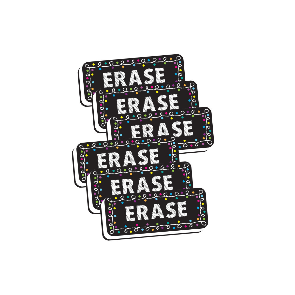 Fun and colorful design to brighten up your magnetic whiteboard. Easy to grip and hold for adults and children. Use with dry erase markers. Eraser is made from a durable foam with a black felt erasing surface. Built in magnet helps to easily stick to magnetic whiteboards and other magnetic surfaces. Measures 2" x 5". Sold as a pack of 6 erasers.