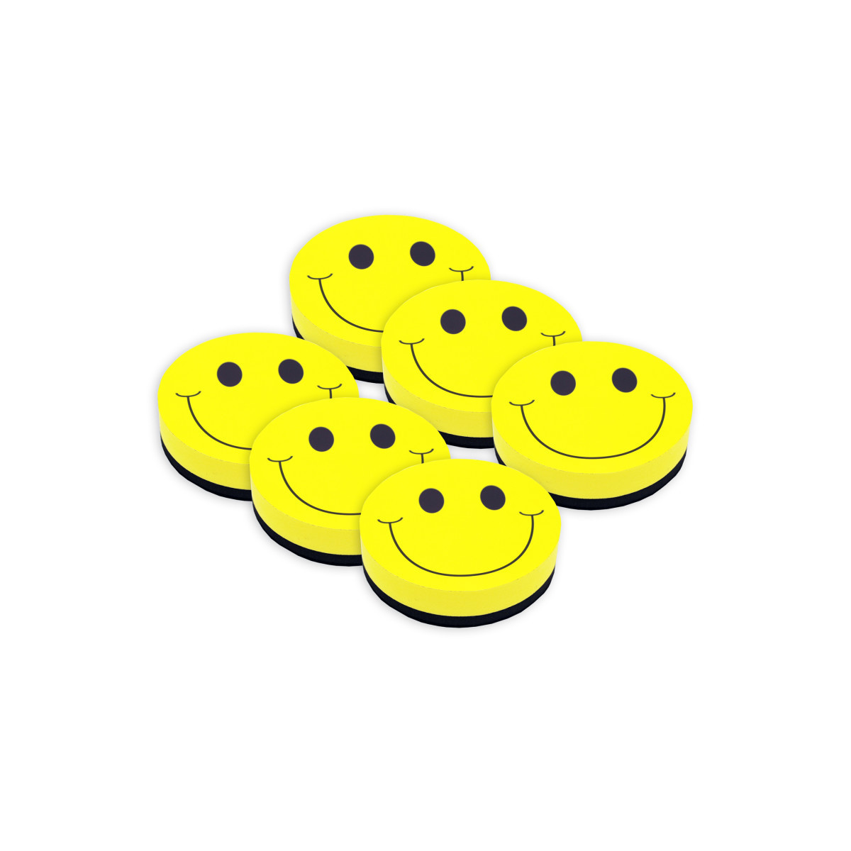 Fun and colorful design to brighten up your magnetic whiteboard. Easy to grip and hold for adults and children. Use with dry erase markers. Eraser is made from a durable foam with a black felt erasing surface. Built in magnet helps to easily stick to magnetic whiteboards and other magnetic surfaces. Measures approximately 3-3/4". Sold as a pack of 6 erasers.