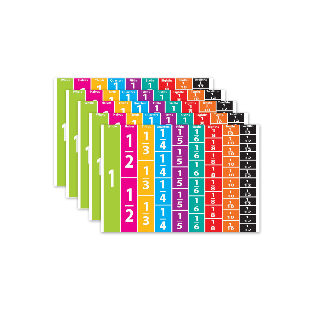 Die-cut magnetic fractions comes on 8.5" x 11" easy punch out sheet. Great for use in the classroom or at home! Great color scheme to help the eye pick out different pre-printed fractions, and great for learning and improving math skills. Write-on/Wipe-off surface allows use with dry erase markers or chalk pens! Each pack includes 51 pieces of pre-printed fractions. Sold as 5 packs for a total of 255 pieces.
