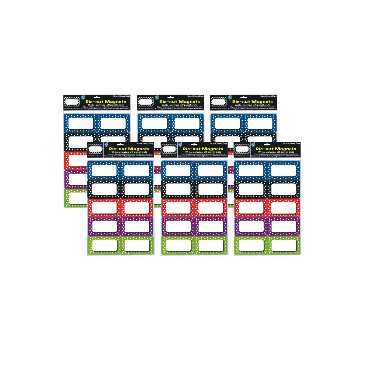Die-cut easy punch out from 8-1/2" x 11" sheet. Use with dry erase markers or liquid chalk markers! Sticks to magnetic whiteboards, steel lockers, refrigerators, or any magnetic surface! Each pack includes 10 pieces. Sold as 6 packs for a total of 60 pieces.
