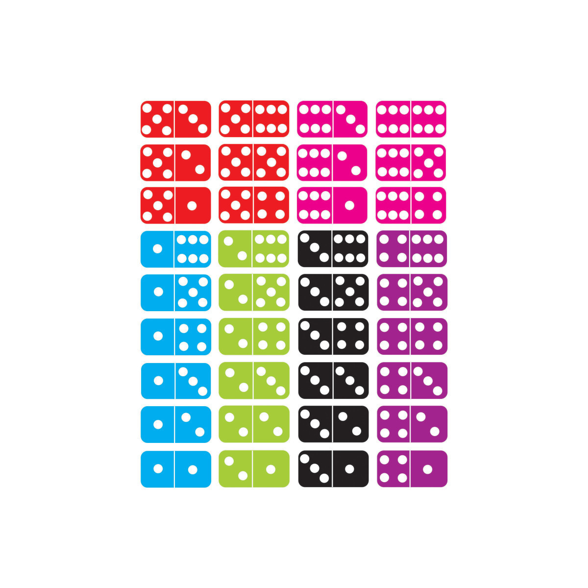 Die-cut Magnetic Dominoes come in a 5" x 15" pack containing the full set of 36 pieces, 1-6/6-6. Sticks to magnetic whiteboards, steel lockers, refrigerators, and more! Great for use in the classroom or at home! Write-on/wipe-off surface.