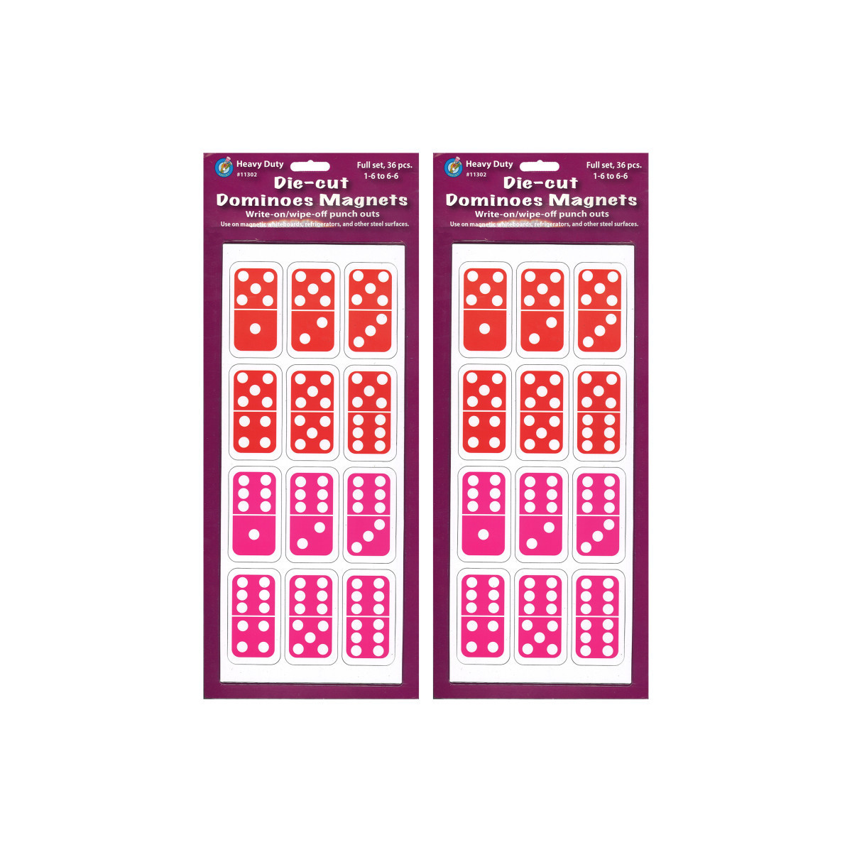 Die-cut Magnetic Dominoes come in a 5" x 15" sheet containing the full set of 36 pieces, 1-6/6-6. Sticks to magnetic whiteboards, steel lockers, refrigerators, and more! Great for use in the classroom or at home! Write-on/wipe-off surface. Sold as 2 packs for a total of 72 dominoes.
