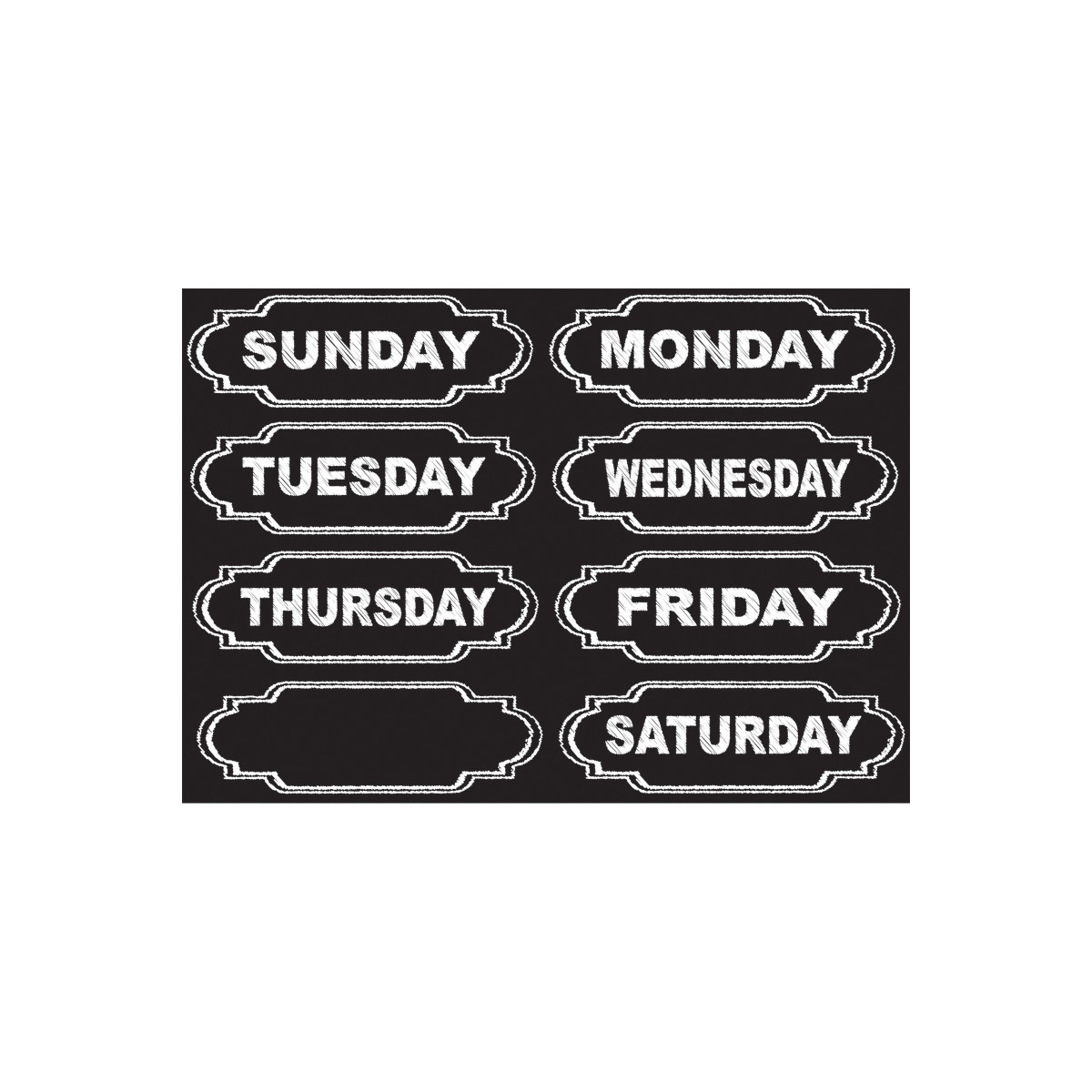 Organize your classroom or home with our magnetic chalkboard style column headers. These pre-printed time savers feature Days of the Week for DIY calendars on magnetic surfaces. Use blank frame to make your own title with liquid chalk markers for best results. Each pack includes 8 die-cut pieces that easily punch out from an 8.5" x 11" sheet. Each piece measures approximately 5.625" x 1.875".