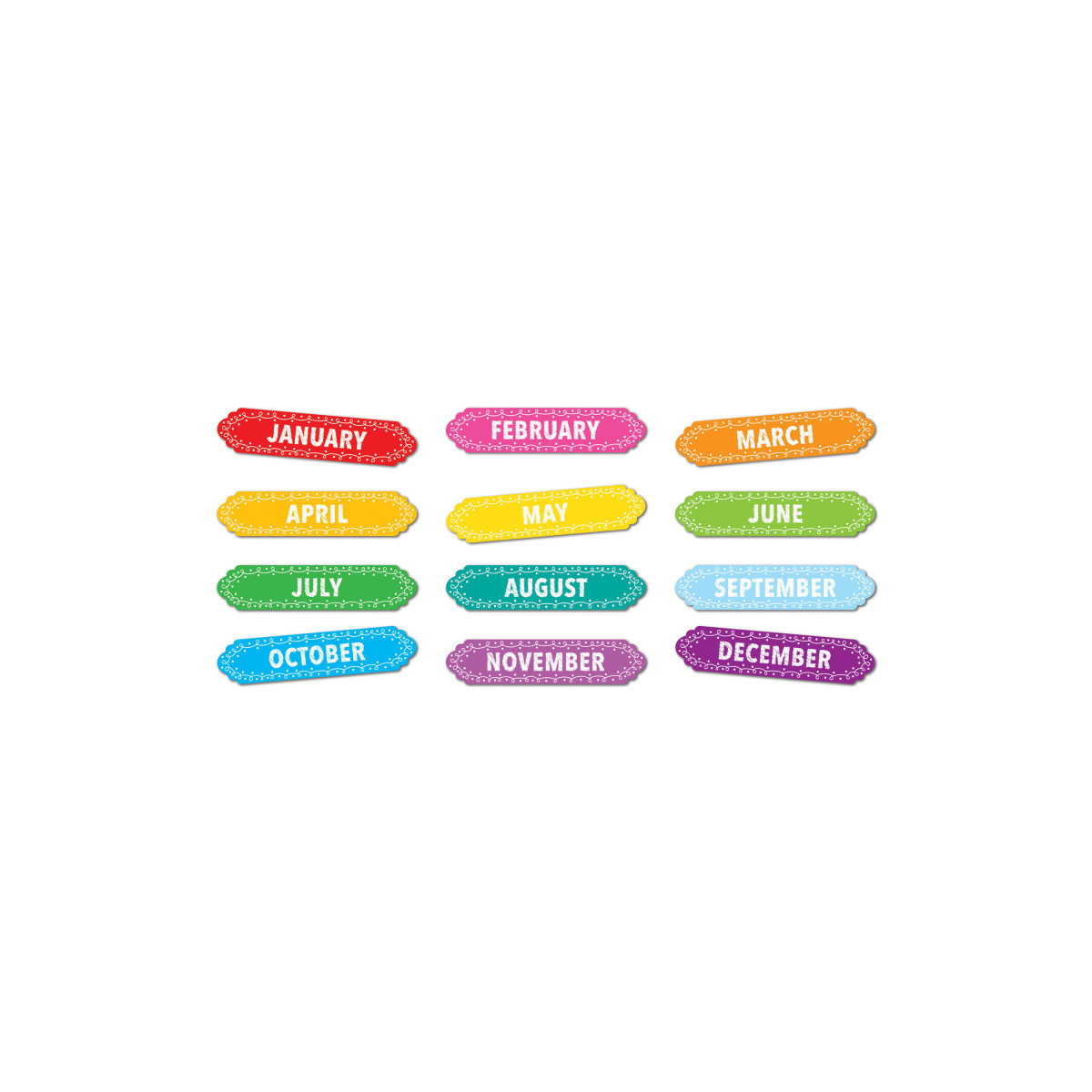 Organize your classroom or home with our magnetic column headers. Use these pre-printed timesavers for DIY calendars on magnetic surfaces. Write names, goals, assignments, and more underneath each column header. Each pack includes 12 pieces (1 per month) that easily punch out from a die-cut sheet.