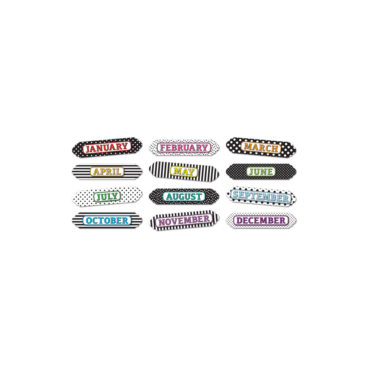 Organize your classroom or home with our magnetic column headers. Use these pre-printed timesavers for DIY calendars on magnetic surfaces. Write names, goals, assignments, and more underneath each column header. Each pack includes 12 pieces (1 per month) that easily punch out from a die-cut sheet.