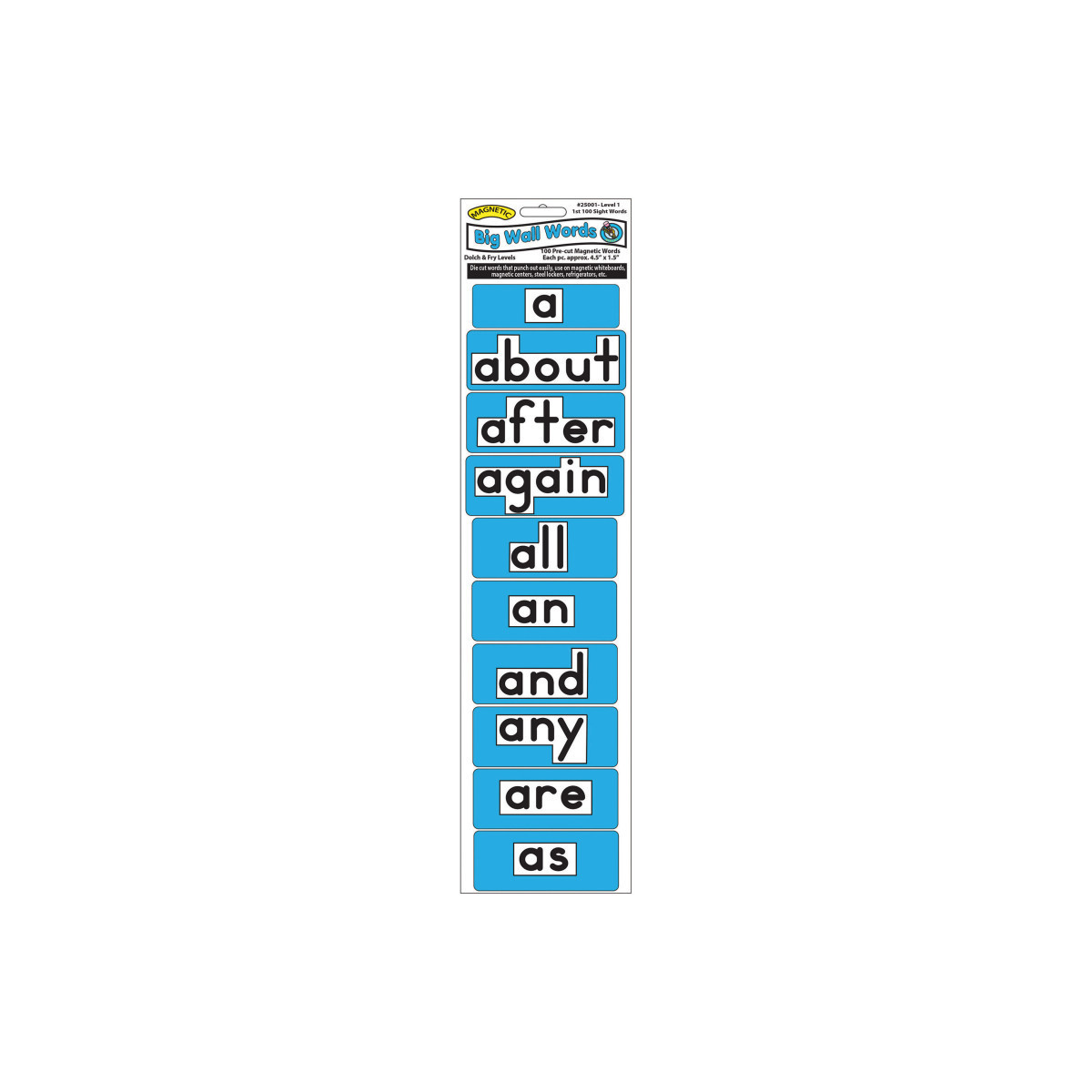Sight Words, often also called high frequency sight words, are commonly used words that young children are encourage to memorize as a whole by sight, so that they can instantly recognize these words in print without having to use any strategies to decode. Each word measures approximately 1.5" x 4.5". Each pack contains 100 words/pieces of Level 1 Dolch & Fry.