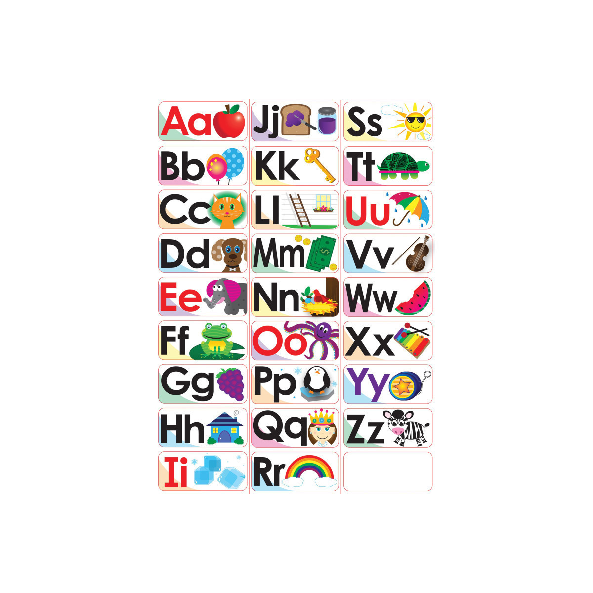 Great for learning letters and words in the classroom or at home! Use on magnetic whiteboards, steel lockers, refrigerators, or any magnetic surface. Double sided for self checking! Each tile has an uppercase and lowercase letter with a picture representing the letter, and on the reverse side is the word for the picture! Each tile measures 1" x 2". Each pack includes 26 letter tiles and 1 blank tile.