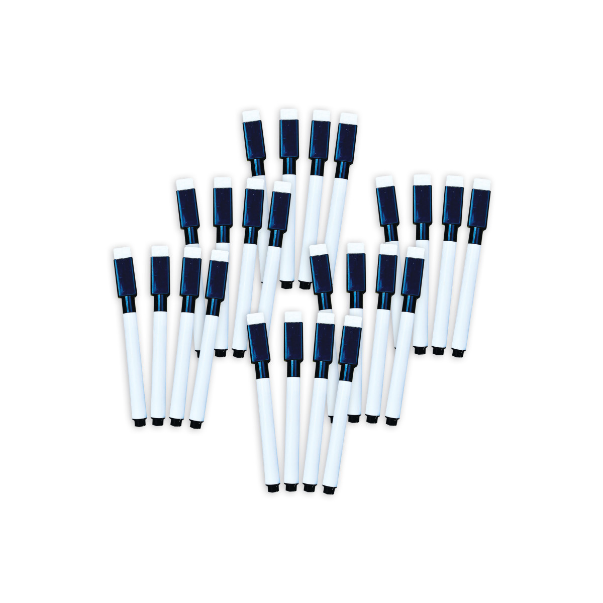 Fine point dry erase markers easily clean and wipe from any dry erase surface. The cap has an eraser attached for easy removable of ink from all dry erase surfaces. Perfect for travel and classroom work. Each pack includes 4 black dry erase markers. Sold as 6 packs for a total of 24 markers.