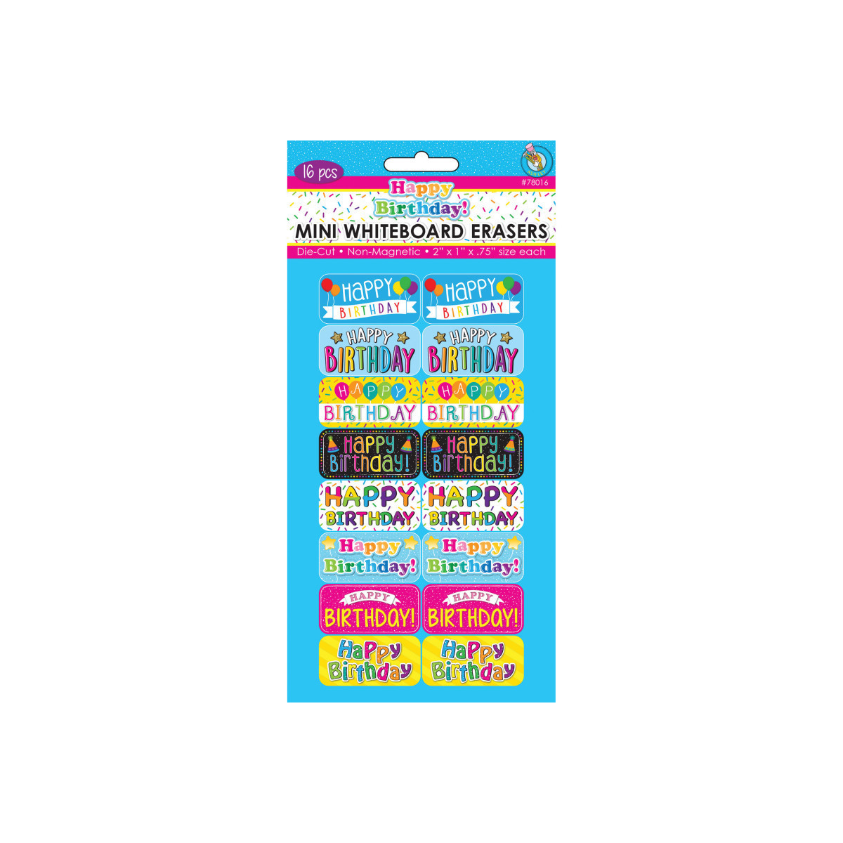 Ashley Productions® Non-Magnetic Mini Whiteboard Erasers, Happy Birthday, Pack of 16