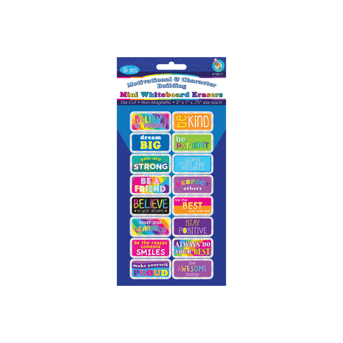 Fun and colorful design to brighten up your magnetic whiteboard. Easy to grip and hold for adults and children. Use with dry erase markers. Eraser is made from a durable foam with a black felt erasing surface. Makes a great incentive item. Each pack includes 16 erasers.