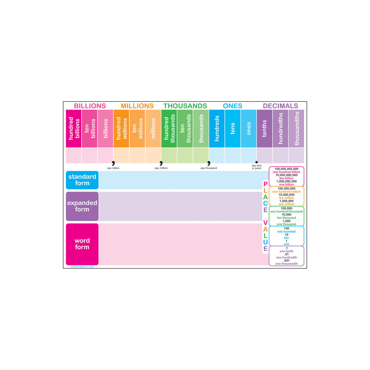 Smart Poly™ material has been designed for charts in the classroom and home. These charts are strong, durable, water resistant, and do not need lamination. They can be displayed like any chart with Ashley Smart Tak™, pins, tacks, staples, etc. The surface is designed for dry erase and water based markers and washable crayons. Chart measures 13" x 19" with a dry-erase, glossy surface, .45mm. The Place Value chart allow you to practice writing place value in various ways.