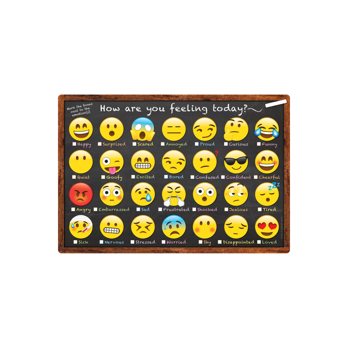 Smart Poly™ material has been designed for charts in the classroom and home. These charts are strong, durable, water resistant, and do not need lamination. They can be displayed like any chart with Ashley Smart Tak™, pins, tacks, staples, etc. The surface is designed for dry erase and water based markers and washable crayons. Chart measures 13" x 19" with a dry-erase, glossy surface, .45mm. The Emotions Icon How Are You Feeling chart features boxes to mark next to each emotion to help children to show how they are feeling.