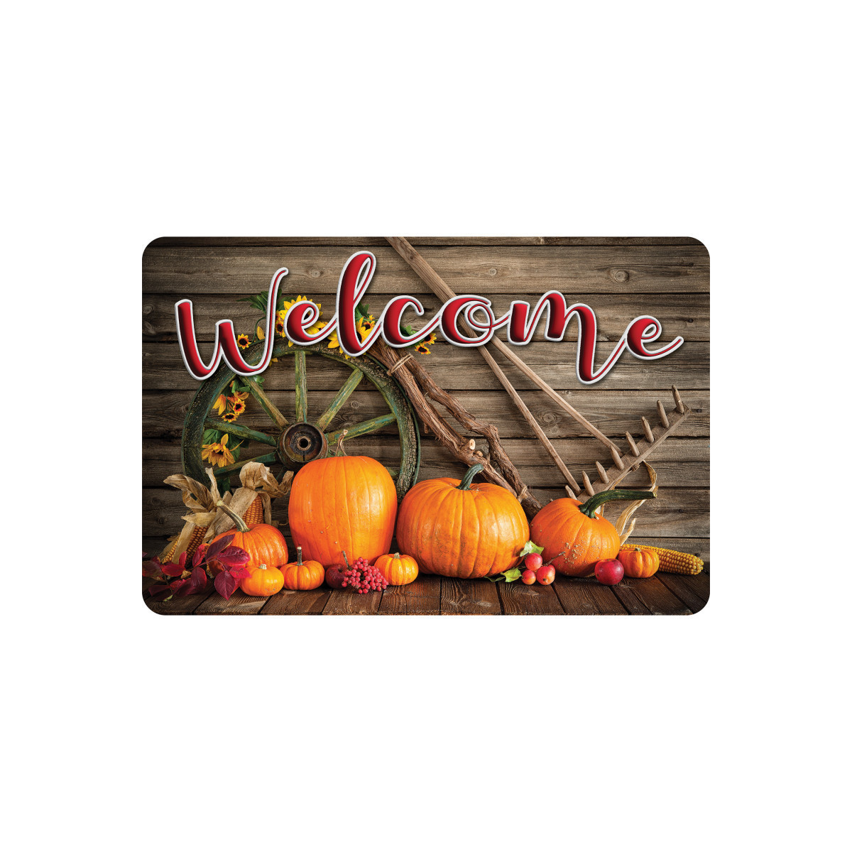 - Measurement & Design: The Harvest Wheel Rake Welcome Mat measures 15.5" x 23.5".