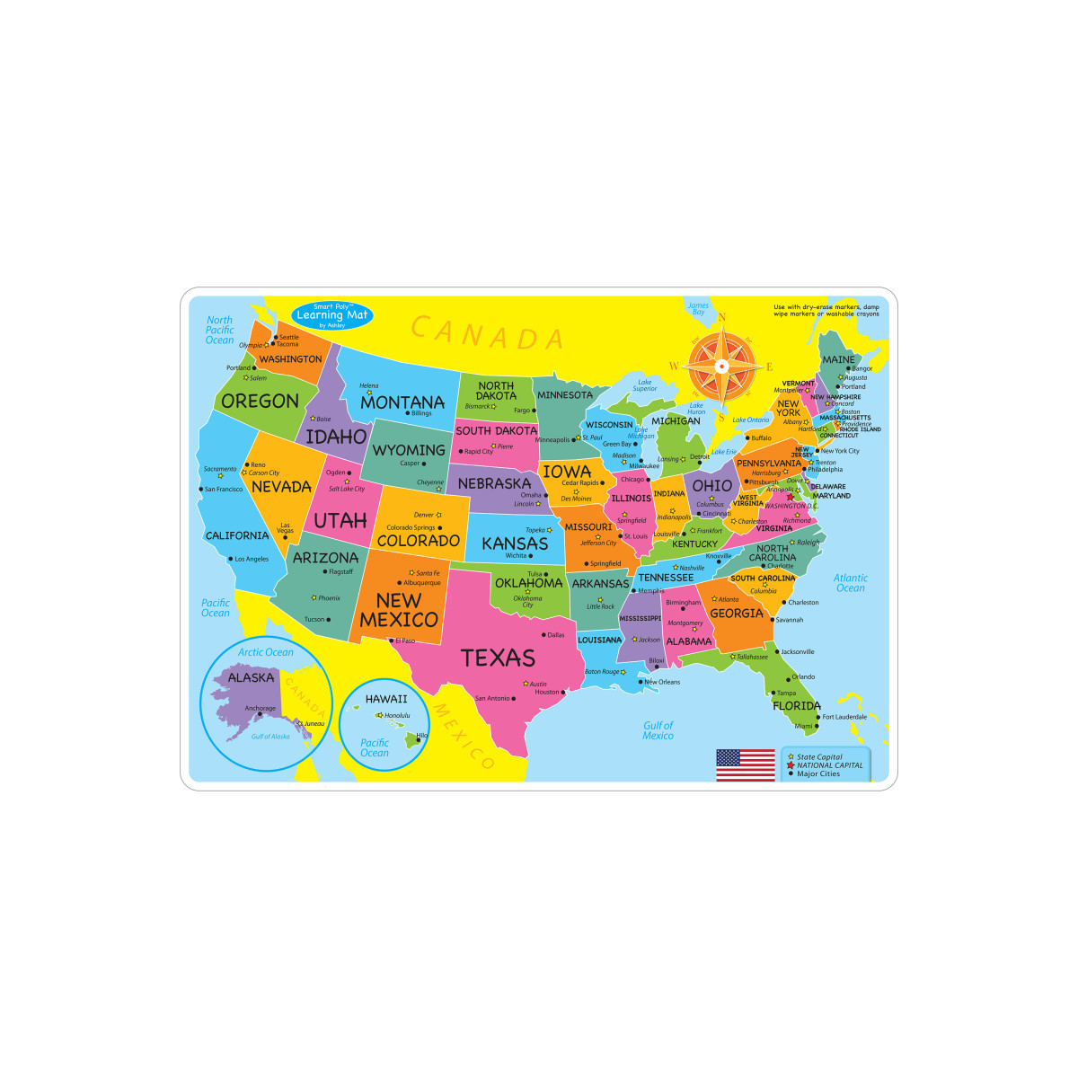 Smart Poly™ material has been designed for the classroom and home. The material is strong, durable, water resistant, and does not need lamination. Practice learning geography with the U.S. Basic Map learning mat. Label states, capitols, major cities and bodies of water. Heavy duty double-sided surface for fun and colorful learning on both sides. Write-on/wipe-off surface. Use with dry erase or water based markers and washable crayons. Each side is an interactive lesson. Mat measures 12" x 17".