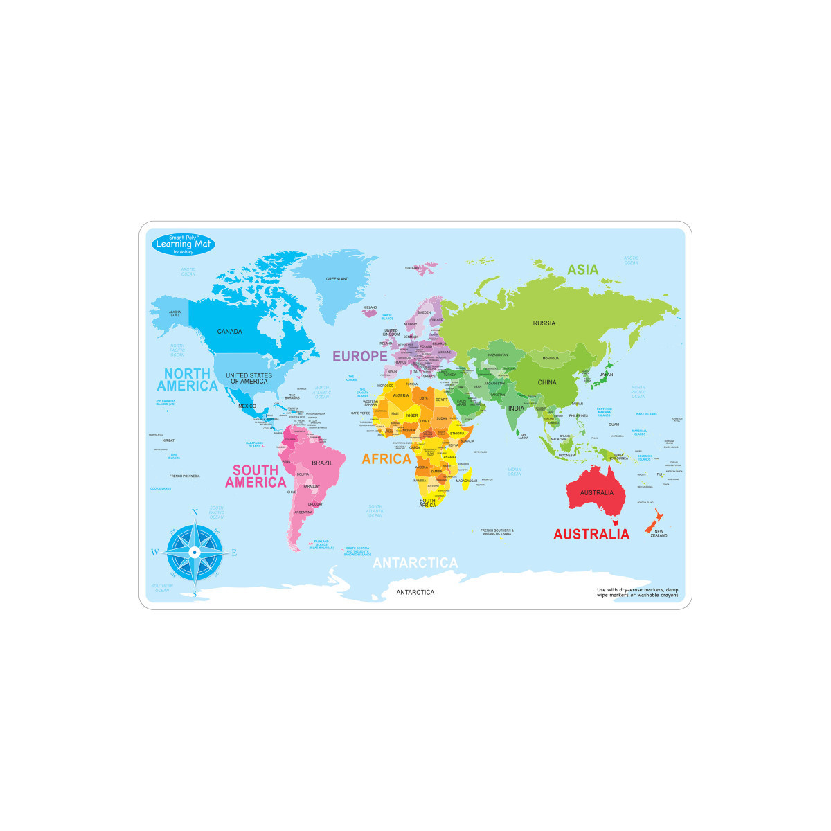 Smart Poly™ material has been designed for the classroom and home. The material is strong, durable, water resistant, and does not need lamination. Practice learning world geography with the World Basic Map learning mat. Label countries and bodies of water. Heavy duty double-sided surface for fun and colorful learning on both sides. Write-on/wipe-off surface. Use with dry erase or water based markers and washable crayons. Each side is an interactive lesson. Mat measures 12" x 17". Pack of 10 learning mats.