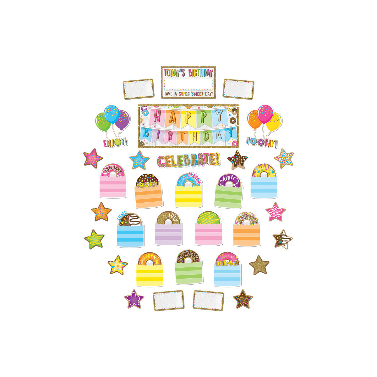 The Smart Poly® Birthday Mini Bulletin Board Set includes 33 pieces in the Donutfetti design. Made from a long lasting plastic material that does not require lamination. The surface is write-on wipe-off with dry erase or water based markers. Washable and easy to clean.